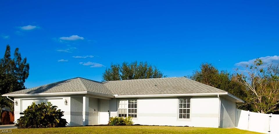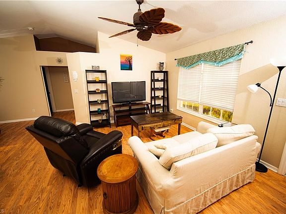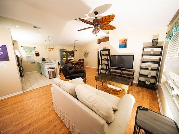 NO HOA! DON’T MISS OUT on this lovely 3 bedroom, 2 bath home situated on a large fenced lot with a private backyard and room for a pool. As you enter through the front door, you are greeted by a welcoming living area with laminate floors, vaulted ceilings adorned with a charming plant shelves a large window that bathes the room in natural light. The fantastic open kitchen boasts new stainless appliances, and a breakfast bar, perfect for both meal prep and casual dining. The adjacent dining area, with its sliding doors, opens to a comfortable screened lanai, offering serene views of the private backyard—a perfect spot for family meals and entertaining. The generous primary suite is designed with comfort in mind, featuring laminate flooring, a walk-in closet and an en suite bathroom complete with a step-in shower and vanity. Two additional bedrooms and a guest bathroom are located on the opposite side of the home, ensuring added privacy. The screened lanai is ideal for entertaining friends, while the fenced backyard provides a safe haven for kids and pets to play. The roof & fence were replaced in 2018, the water heater and A/C were replaced recently as well. Conveniently located near SWFL International Airport, Fort Myers Beach, Florida Gulf Coast University, Gulf Coast Town Center and Hertz Arena, this home is perfectly positioned for both family living and investment opportunities. Community parks as well as a community pool are close by. Call today for your personal tour and experience the charm and comfort of this beautiful home firsthand.