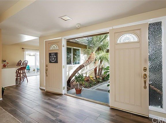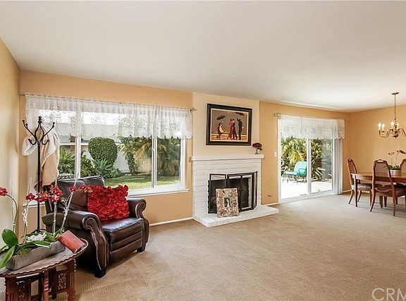 Beautiful 3 bedroom 2 bathroom single story home nestled in a quiet cozy cul-de-sac. Beautiful landscaping that has colorful flowers and many mature palm trees and a private courtyard with a double door entry way. This home is spacious, light and bright with a two car garage that has direct access to this home. There is Fireplace in the large living room. The master bedroom has a mirrored wardrobe closet and vanity area as well. Too many features to name must see to fully appreciate!!
