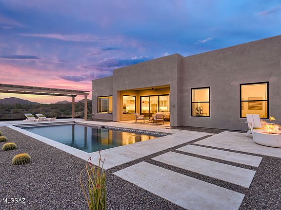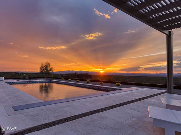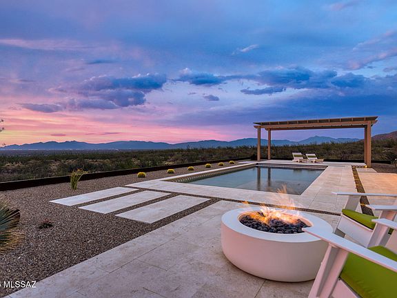 Perched on 4.1 pristine acres in the ocotillo-strewn foothills of the Santa Rita Mountains at the edge of the Coronado National Forest, this 2023 soft-contemporary retreat captures sweeping, unobstructed views of the surrounding mountains and valley below. From its elevated vantage point, experience Tucson's iconic sunsets, endless star-filled skies, and sparkling city lights. With clean architectural lines and modern finishes, this private sanctuary is designed as a place to reflect, rejuvenate, and recharge.A long driveway leads to a limestone walkway and covered entry, where a custom contemporary glass front door sets the tone. Inside, a wall of windows frames the uninterrupted views while filling the interiors with natural light. Continued...