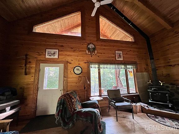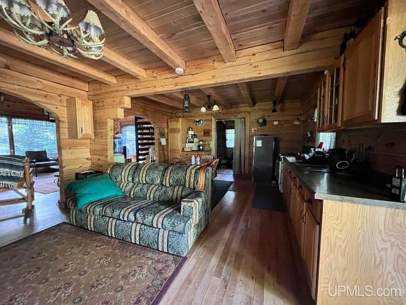 This gorgeous custom log home is a must see! Nestled on 40 acres, and adjoined by thousands of acres of Federal Forest land, you will love the peace and tranquility this property has to offer. As you enter this off grid home that is powered by solar and generator, you instantly notice the thought and detail that went into building this magnificent structure, right down to custom woodwork accents. The kitchen is open and spacious with plenty of cabinets and counter space. Off the kitchen a small addition was put in for storage and a stand up shower. The arched doorways lead you to the stately livingroom while keeping a cozy vibe featuring a high ceiling and large picture window overlooking the back porch and woodlands. A free standing wood stove occupies the corner of the room and has proven to warm the home on even the coldest nights. Up the spiral staircase to the second level, you'll find a generously sized bedroom with a balcony to enjoy your morning coffee. Outside, the grand porch on the back of the home will take your breath away. You'll soon imagine yourself here relaxing with friends and family while listening to the purl of Cliche Creek. This seasonal creek is a tributary of the Silver River which runs a short distance east and south from the parcel. Nice mixture of hardwood and softwood! Plenty of hunting and fishing opportunities along with year round access gives you more freedom to enjoy this property all year! About a mile south to Trail 12 snowmobile trail. This could be your home away from home or your permanent residence! Don't let this one slip by! Seller is selling as is.
