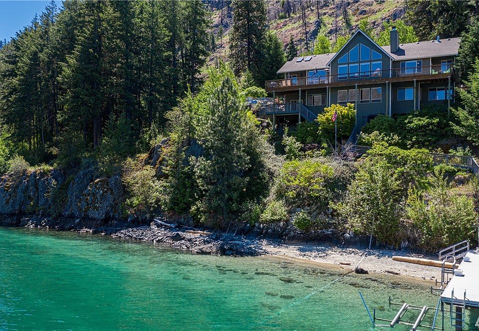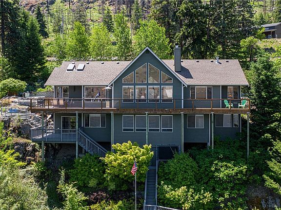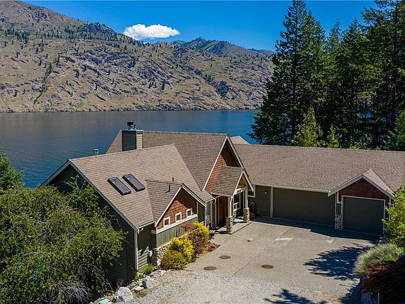 The Lodge at Lake Chelan has almost 3700 sq. ft. with 4 bedrooms ( 2 Master Suites) 3 1/2 bathrooms.Over 100' of waterfront on Lake Chelan. Large oversized dock with boat lift and jet ski lifts. Master bedroom on the main floor and open floor plan with great room. Large side yard with firepit, basketball hoop and jacuzzi spa. Garage door opens at both ends so rec room becomes part of the outside play area. Extra boat parking. Vacation rental history established. Life is good on Lake Chelan.