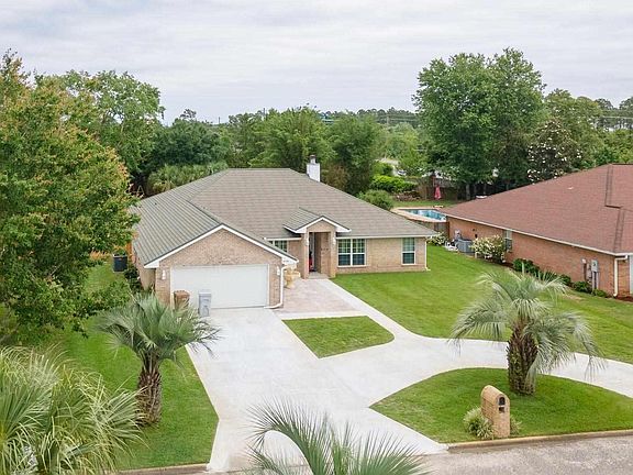 Beach traffic? No Problem! Walk to Grocery Store? Absolutely! Just off Navarre Parkway on a cul-de-sac with street lights, close to shopping & the new Hospital Emergency Room. So one of the first thing you will notice is the metal composite roof & the large circular driveway with lots of parking & even a fountain on the front patio. Then when you walk inside - your eyes will be drawn immediately to the back yard & that amazing pool. Just imagine it - floating with an umbrella drink in your own private pool while listening to the fountains spraying softly & the aroma of jasmine from your trellis - aaahhhh. Ok - so back to reality - the yard is Zoysia grass & completely fenced with a sprinkler system, but also has not just a shed but an additional workshop (man cave or she shed) as well. Then inside you will love all of the hard floors - custom tile, bamboo, luxury vinyl plank & travertine - & high ceilings. There is a formal dining room & gym or office at the entrance & custom tile in the great room & kitchen. Then in the greatroom - you can watch the fireplace, tv & pool fountains at the same time - unless you just want to get back in the pool. The large bright kitchen features high ceiling, white cabinets & appliances & contrasting black granite with a large eat-in area & breakfast bar. The master suite is GINORMOUS & the bath has 3 closets, separate shower, soaking tub, water closet(commode room), double vanity, granite countertops & is large enough for a fireplace for those times you just want to be warm when getting out of the shower or tub. The 3 additional bedrooms all have hard floors & large walk-in closets. Then there is the guest bath - large enough for many guests - unless you dont want them to stay ;). There are plantation shutters, cat5 ethernet outlets, programmable thermostat for the 2 stage 4T HVAC with UV air purifier & storm doors on the front & back doors. What are you waiting for?!?!? You will just love living here! New Pool Liner Coming.