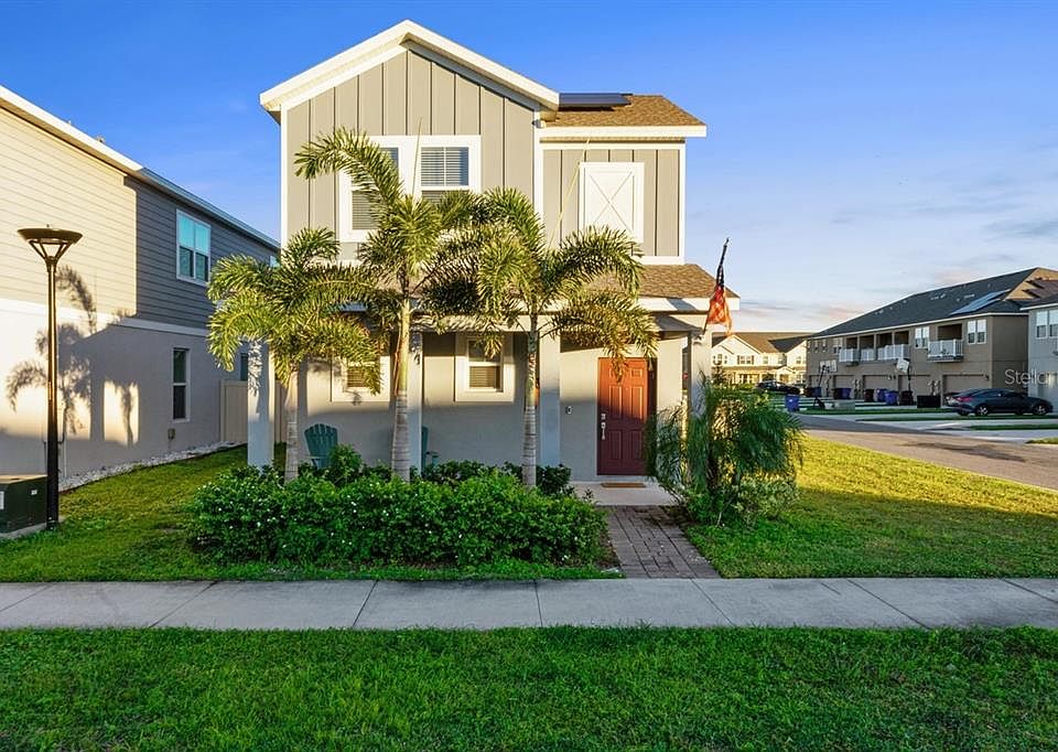 Immaculate modern classic 3 bedroom and 2.5 bathroom two-story home nestled on a premium corner lot located on a quiet street just steps away from the resort style amenities in the sought after residential community of Tohoqua. The Autumn exudes elegance and good taste. As you enter, you are greeted by ample open space with lots of natural light flowing through. The modern style open kitchen features stainless steel appliances, a large island with quartz countertops that opens to the elegant dining room and spacious family room with wall-to-wall wood like tile planks. This wonderful home features a back porch with a detached rear load 2-car garage, a fenced-in side yard, a laundry room that includes a washer & dryer, a convenient half bathroom on the first floor, a spacious master suite with a large walk-in closet, and a spa inspired master bathroom with his/hers sinks and a glass enclosed shower. This home is green energy efficient thanks to solar panel technology that helps reduce the electric bill. At Tohoqua, families can utilize the resort-style swimming pool, clubhouse with a fitness center, and tennis and pickle ball courts along with walking trails throughout the community.