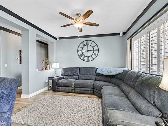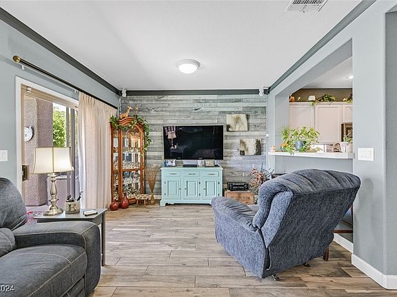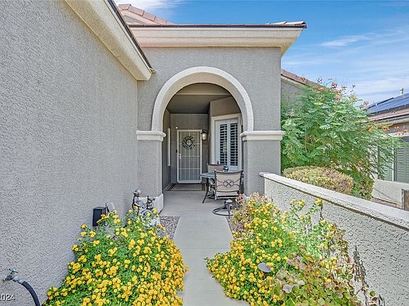 This is the Gem of Sun City MacDonald Ranch with a pool overlooking the Las Vegas Strip. This home is turn key and requires little to no maintenance or upgrades. Upon arriving, you'll walk into the entrance which is showcased by a beautiful courtyard and sitting area. Some of the great aspects of this home include an AC unit that was installed in 2020, recently installed porcelain plank flooring, updated kitchen with white refinished cabinets, Quartz countertops, and all stainless steel appliances. There's a beautiful wood plank accent wall in the family room, which leads to the cozy covered patio with a built in barbecue and to a pool and spa with a 2022 variable speed pool pump. You'll love this space with a panoramic view of Desert Willow Golf Course and the Strip. There is also access to a community center, which boasts pickle ball courts, a gym, social calendar, community golf, and several other amenities. This rare property won't last long!
