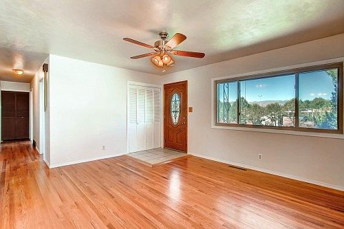 Perfect condition inside and out. Huge lot with large trees, covered rear patio, storage shed, gardens, sprinkler system, Pikes Peak views, alley access and a 2 car garage perfect for shop with additional lighting and 220v service. Hardwood floors, security system, vinyl windows, tile floors, tons of storage, ceiling fans, dining area, up graded appliances, new roof and more. Move in today and have to do nothing!