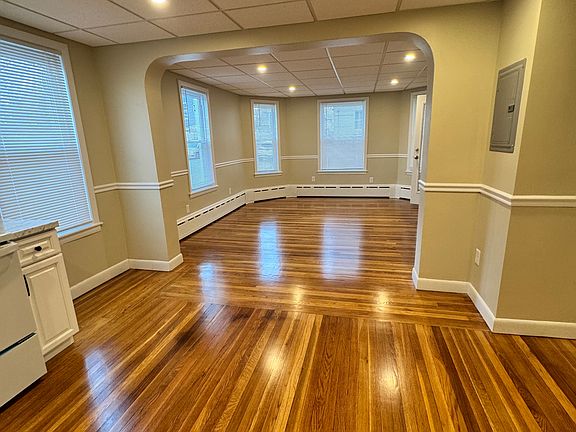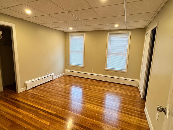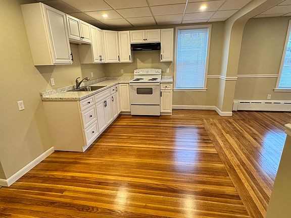 Spacious 1st floor 2 bedroom 1 bath apartment available now. Hardwood floors, baseboard heat. Onsite coin-op laundry. New kitchen and bathroom. Stove and refrigerator included.