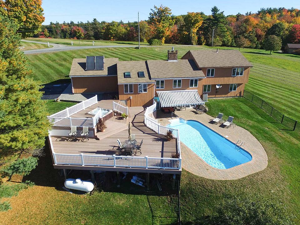 Views Views Views!!! This home has the view everyone dreams about! Distant mountains, vast farm fields, rolling hills. This entire home has been set up to take advantage of the view with lots of glass and a very large composite deck with multiple tiers and a large patio area around the in-ground pool. The extra large deck begs for summer pool parties and grilling. The hot tub is built into the upper level deck for easy access. Inside boasts a nice kitchen with stainless steel appliances open to a large dining with high ceilings and skylights. Spacious living room space with center fireplace. Dual master bedrooms on different levels give the home flexibility for the potential of an in-law scenario. 6' tile shower with dual heads and modern up to date vanities. Triple glass doors from the finished basement give you direct access for a dip in the pool or relaxing on the patio. All this sitting on 19 acres with approx 4.5 acres of open field great for horses, gardens or hobby farm. In a neighborhood of nice upscale homes and even a nearby vineyard. New roof and freshly painted inside and out - this home is turnkey and ready for it's proud new owners. Agent related to seller.