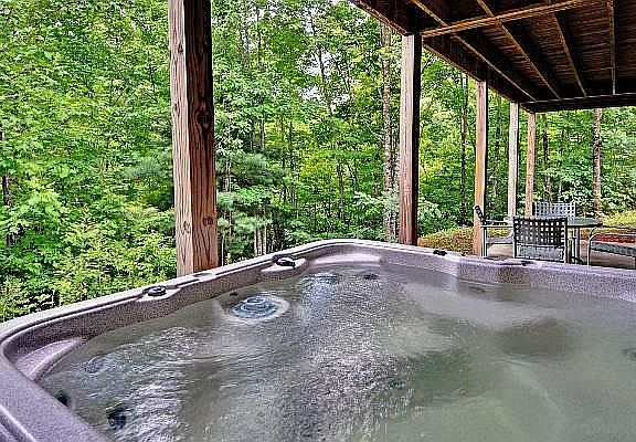 Here's the quiet, cozy mountain getaway you've been looking for. An immaculate, true log, 3 BR/2 Bath cabin in a small, attractive cabin community. Custom Quartz & tile upgrades in kitchen & baths, massive river rock wood burning fireplace in an open living area. Enjoy the lovely wooded/ seasonal mountain view from large wrap around porch with rocking chairs, outdoor patio & umbrella set, w/ great hot tub on the lower level patio. Has a full, finished basement, a third bedroom, unfinished 3rd bath, with a home theater. Level, circular drive with plenty of parking. The nice furnishings are negotiable. SUCCESSFUL RENTAL HISTORY. You're gonna love it!