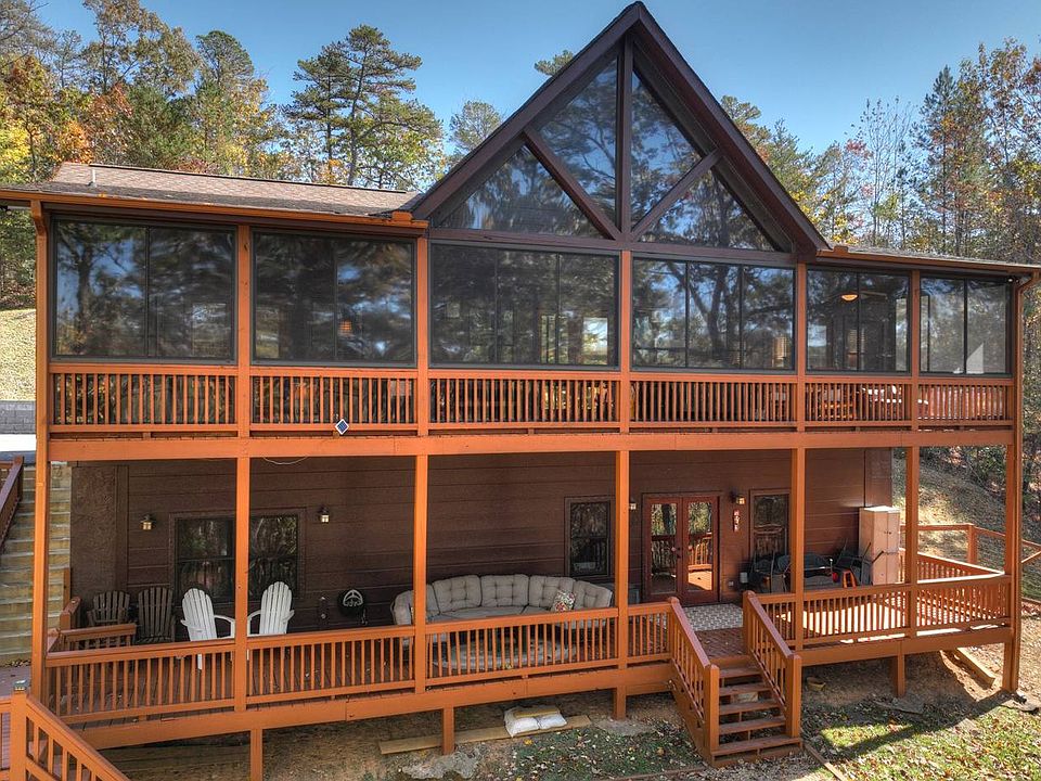 Motivated Sellers! This gorgeous home is nestled in a quiet, gated community, Leatherwood Mountain. It is perfectly situated in Cherry Log, between Blue Ridge and Ellijay, just 10 minutes to town! Open plan with cathedral ceilings and attractive furnishings make this house feel like home. Cozy up to the gas log fireplace or spend time on the large porch with year round mountain views. On the main level, the Primary Bedroom Suite is spacious and has two walk-in closets, a full bath with dual vanities and a custom tiled shower with river rock bottom. The Secondary Bedroom has a full bath with single vanity and custom tiled shower with river rock bottom shower. Beautiful granite counters in the kitchen with lots of cabinets and an island. The screened porch, upgraded by Porch 365, is fitted with vinyl sliding windows and screens, for use year round. Downstairs is amazing! There is a large living room and game room complete with Bar and Pool Table. Plus, there is a third Bedroom with a Full Bath. Notable features: Whole House Water Filtration System, Radon Detector, Paved Level Driveway and Accessible Ramp. Ideal location...Close to hiking trails, Lake Blue Ridge, the Toccoa River, Mercier Orchards and more! Home is furnished with some exceptions. Exceptions can be purchased on separate bill of sale. See every detail on the Virtual Walk Through Tour! Even better, see it, in person, today!