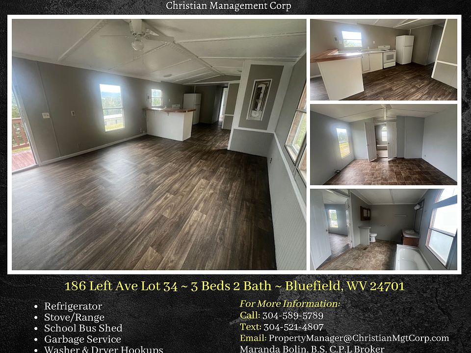 186 Left Ave Lot 34 ~ 3 Beds 2 Bath ~ Bluefield, WV 24701 LEASE OPTION (Path to Home Ownership): Initial payment: $1,500 with no payments due until the 1st of the following month! Monthly payment: $795/month. Trash & lot rent are included. or RENTAL: Security Deposit: $795. Can be made in payments if needed. Monthly payment: $795/month. Trash & lot rent are included. Sorry, this home is not HUD approved. This three bedroom two bath mobile home located at The Oaks MHP features bright rooms, small flat yard with amazing views, washer & dryer hookup, and open concept kitchen. This home is located in a quiet community behind the Brushfork Armory in Bluewell and trash pickup is included in the rent. Christian Management Corporation Office Hours: Mon-Fri 9:00AM-5:00PM & 10:00AM-2:00PM the 1st Saturday of every month You can view THIS property 7 days a week! Most pets welcome with a $300.00 pet fee per pet and signed pet agreement. Maximum 2 pets. No aggressive breeds due to insurance restrictions. Clean, safe, quiet, crime & drug-free are our priorities for our residents! We support Equal-Housing Opportunities! Good people with good, bad, low, or no credit but stable employment or Social Security are welcome. -MUST pass background check -NO evictions in the last 7 years -NO sex offenders Is this property not what you are looking for? View our other available #homes, #mobilehomes, #apartments, and more on our Facebook or our website!