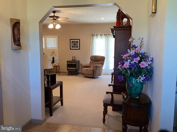 Spacious Brick & Vinyl Rancher w/Carpet & Tile Floors, Kitchen w/bar & lots of Cabinetry, Breakfast Room w/Bay Windows, Appliances, Formal DR w/Chair Rail, Pellet Stove, Lrg MBR w/ Walk in Closets, Tray Ceilings, MBA w/tile Floors, Two Separate Sinks, Tile Jetted Whirlpool Tub & Shower Glass Door Stall, Window Coverings, Recessed Lighting, Wide Hallways, Leaded Glass Front Door, 4 Main Level Bedrooms, 2.5 Bath, Separate Laundry Room, Large Composite Deck, Covered Front & Rear Porch, Playground Equip, 2 Car Garage w/opener & Extra Storage Space, Detached 1 Car Garage, Water Softener. Landscaped Yard, Invisible Fencing, Backs to Trees & Mountain Views on over an Acre.