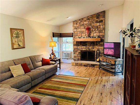 Picturesque Tranquility in all Seasons! Serenely nestled amid vibrant lush trees and tightly serpentined by elevated wrap deck overlooking natural beauty and whispering creek is this spectacular one-of-a kind aspen-inspired ranch inviting complete relaxation. Showcasing unforgettable architectural appeal w/dramatic wood-adorned cathedral ceiling in the sprawling DR accented by soaring floor-to-ceiling 360 exposed brick fp and illuminated by sensational wall-of-glass that invites without interruption the outdoors in. Vaulted sunken LR anchored by log stone 2nd fp adjoins a beamed cathedraled den which soaks in stunning visuals of the DR through rustic interior window and alluring outdoors through a 2nd wall of glass w/deck access. Rich-hued natural oak kit efficiently designed for cozy appeal boasts intimate seating and fp views. Awake everyday in the MBR w/ensuite bath capturing views of surrounding park-like privacy that are only steps away. Expansive walkout LL w/GR,3rdfp,4thBr