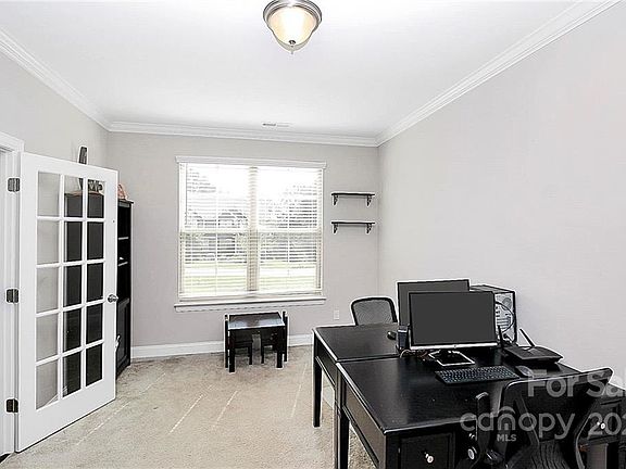 Gorgeous two-story home situated on a level one acre lot with tons of privacy and trees at the end of a cul-de-sac. First floor bedroom with full bath. Office or living room with French doors. Formal dining room with custom trim and moldings. Dark hand hewn wood floors throughout 1st floor. Two-story great room with built-in shelving and gas fireplace. The open kitchen features white cabinets w/granite counters and a large walk-in pantry. Upstairs there is a big primary suite with a tray ceiling, huge bath and walk-in closet. The large laundry room features extra storage shelving. Crown molding throughout. Most of the home has modern light gray walls. Low Iredell county taxes and Mooresville Graded Schools. New Publix being built just 2 miles away! Close to downtown Mooresville, shopping, dining and entertainment.
