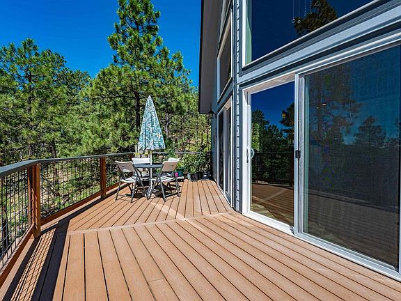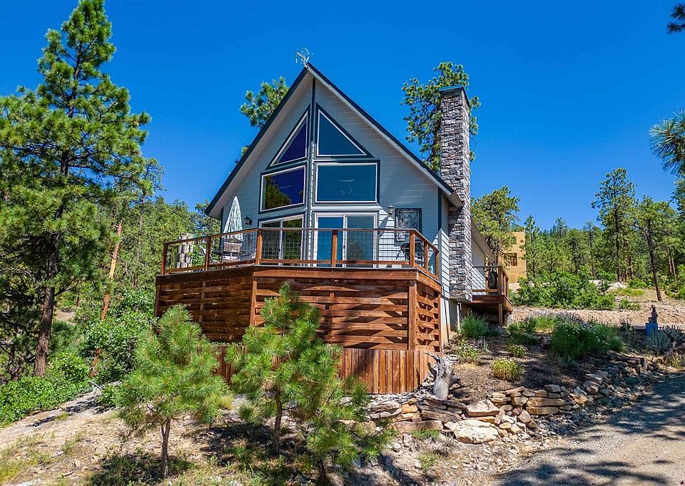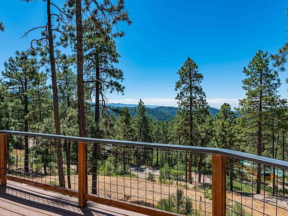 Top of the world views, looking south all the way to New Mexico, this well-built home nestled on 1.53 acres was designed with every detail perfected, making it a phenomenal place to call home. Natural light radiates the space, with south facing windows on the entire front facing of the home, allowing light to beam into the living room, kitchen, dining, and loft. Sit in the living room, cuddled by the warm wood stove or sit on the deck to enjoy the views looking south to New Mexico. On the main level are the two bedrooms, living space, kitchen, bathroom, and laundry. Upstairs is a large loft that would make for a great second sleeping space, a workout area, home office, or media room. Kitchen features custom stained concrete countertops, soft close cabinets, stainless steel appliances, crisp white farmhouse sink, tiled back splash, and a stunning wood bar top made from remnants of a B52 bomber jet. The kitchen opens up to the living space for great entertainment of guests, while also enjoying the views out the wall of windows. Tongue and groove vaulted ceilings, high end laminate flooring, neutral and fresh paint throughout, solid wood doors and trim, classic lighting and fixtures, and immaculately maintained. The deck looking south makes the perfect spot for supper or coffee in the morning, enjoying privacy and the sound of whispering pines. Need a little quiet or place to lay your head, the property also offers a custom-built treehouse (comes fully furnished). Just a few steps from the main home, the treehouse is the perfect space to spend an evening looking at the stars, a space to read, to work, or for the kids to play. This home was built with no detail left untouched, plenty of storage, well insulated, high-end finishes, built to perfection for full time or second home living, designed to provide comfort, sustainability, and a beautiful connection to nature. Looking for a second home, this one can come mostly furnished and ready to go. Don't miss this GEM of a home, it won't last.
