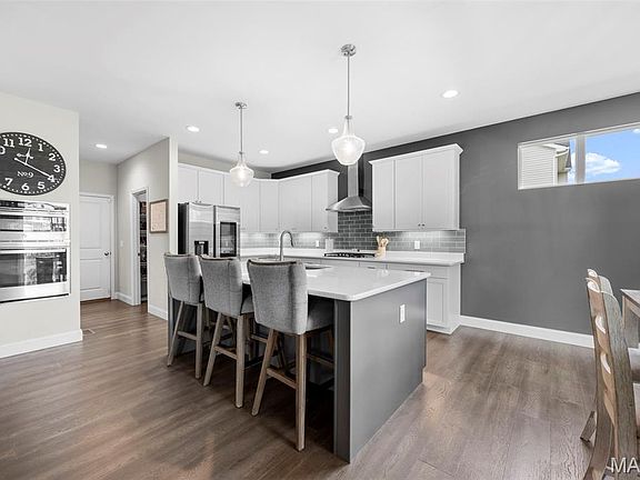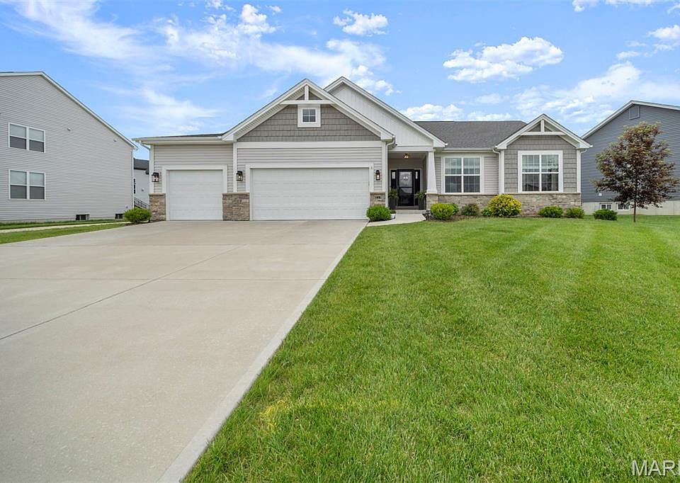 4 BD, 3BA ranch in the desirable Inverness neighborhood! This like-new home has impressive curb appeal w/light Craftsman flair, stone, shake accent siding, arch shingles, beautiful landscape and a 3 car garage. There is lawn irrig, a patio, fenced yard and adjoins common ground/walking trails. Features inc an open flr plan, 9 ft ceilings, Grt Rm window wall, gas FP w/stacked stone, B/I shelving, LVP floors, 42 inch white cab w/crown, chimney style range hood, large island w/quartz c-tops-pendant lights-seating bar, SS appl, gas c-top, wall ovens, transom windows, bev center, W/I pantry, laundry room w/cabinets, double door entry to the Primary Suite, W/I closet, raised height double bowl vanities in the Primary Bath, added height tile shower w/seat and more. The finished LL adds a Rec Rm, Family Rm, Workout Rm, full bath & bdr w/egress window. There is approx 3,251 s/f of beautiful living space. Desirable Wentzville schools, easy access to Hwys 364 & 40/61, shopping, SO MUCH TO LOVE!
