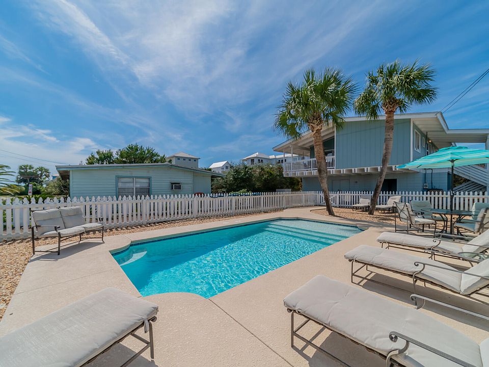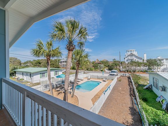 This charming ''old Florida'' style two-story fully furnished beach cottage in the tranquil community of Inlet Beach features 3 bedrooms and 3 baths. This charming coastal retreat is ideal as a primary residence, second home, or investment property. The outdoor oasis includes a fenced-in pool area surrounded by mature palms and coastal landscaping. The second-floor main living area includes an open-concept kitchen, dining, and family room with abundant natural light. The expansive wrap-around deck gives access to multiple outdoor seating areas, perfect for outdoor dining, lounging, or taking in the ocean breeze. The upstairs primary suite offers a spacious layout, king-sized bed and serene views. A private guest suite located downstairs features a king bed with private ensuite bath.