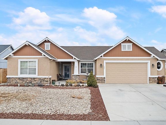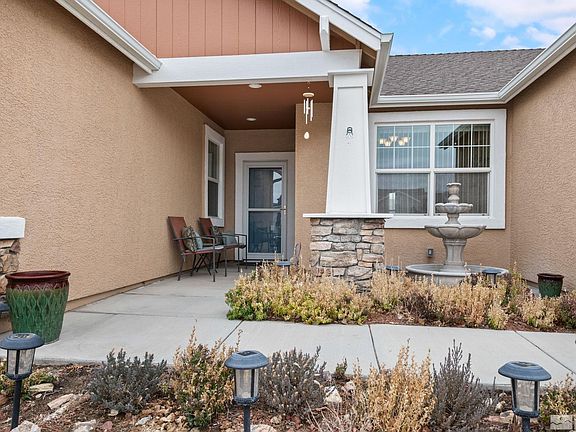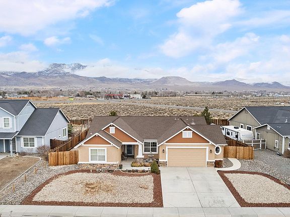 Beautiful Home on Shady Grove!! Maintained to perfection! 1,732 square feet, 3 bedrooms, 2 baths, an OVERSIZED 2 CAR GARAGE w/workbench & shelving + possible RV access. The great room has vaulted ceilings & a cozy gas fireplace with glorious views of the Virginia Mountain Range. The great room is open to the spacious kitchen which boasts adjoins granite counters, breakfast nook, kitchen island, gas range, pantry, newer LG refrigerator & a large breakfast bar., Newer luxury vinyl plank flooring extends through the kitchen & office area. The split floorplan has a private primary bedroom w/walk-in closet , spectacular mountain views from the sliding glass door which opens to one of the covered patio areas. The primary bathroom includes dual sinks, a garden tub, walk-in shower, and private toilet room. The laundry room includes the washer & dryer & has cabinets for extra storage. The opposite side of the home has the 2nd & 3rd bedrooms + bath. One bedroom has double doors which make a perfect office. The stucco exterior of the home was recently professionally painted & has appealing rock trim. Relax & enjoy the front porch area with a three tiered garden/water fountain. Easy-care xeriscape, low-maintenance landscaping with drip system in both the front yard & large back yard. Close by you can walk to the Carson River & the Rolling A open space with disc golf, biking and walking trails, + picnic areas. Call today!!