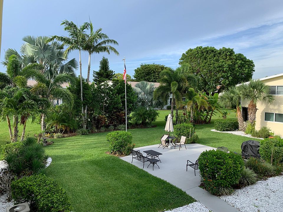 Lovely & elegant CORNER unit in wonderful pet friendly building! Updated kitchen with granite counters and stainless steel appliances. Updated baths. Neutral tile floors throughout. Long enclosed lanai with tile floors & peaceful green views! Beautiful lushly landscaped private patio area for building residents. Building allows one cat or one dog 15 lbs or less. Tucked away yet close to everything - Club House, House of Worship, and Hastings Fitness Center & Pool. Sold furnished (excluding the blue/green bedroom set).A splendid spot to call home!