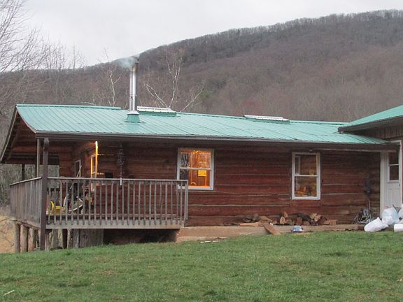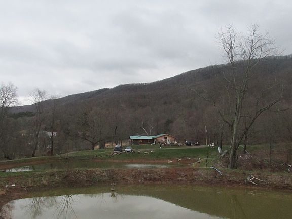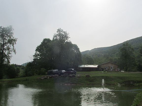 A One of a kind , Hand built Log Home. In a very secluded Mountain setting. It over looks a spring fed pond where about 2000 lb of fish meat is raised per year. The other way looks down on the 64x86 Horse barn. (unused) with the mountain rising behind it.
