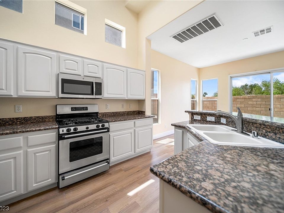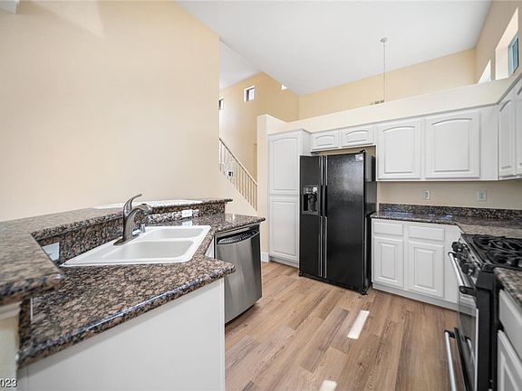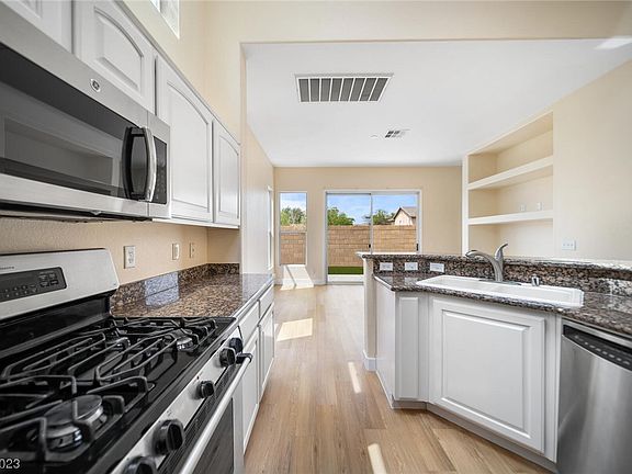 Your newly refreshed home awaits you in this beautiful gated community just minutes from the strip, airport, and major shopping centers. This modern 4 bedroom 3 bath home has newly finished cabinets, a fresh coat of paint and a lot of TLC. Featuring 2 large primary bedrooms one with a balcony. Newly completed backyard with covered patio. Close to schools, shopping centers and easy access to freeway. This well appointed community is stacked with a community pool/spa, basketball and tennis courts, and so much more.