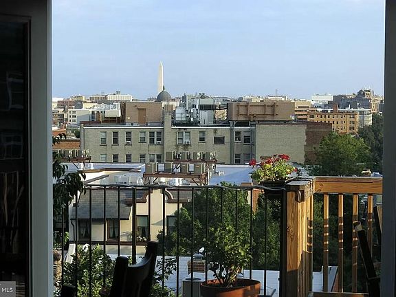This Parisian-style flat located between eclectic Adams Morgan’s 18th Street and elegant and chic Kalorama must be seen in person to be savored appropriately. The Beaux-Arts building, with its classic brick façade and only four apartments per floor, is the very definition of boutique living. Upon entering this home, your eyes immediately try to adjust to the intense light that floods the apartment from the eight large west-facing windows. As your eyes adjust, they are drawn to a set of French doors that face South in anticipation that they open onto a spacious private deck. It is natural and easy to imagine yourself living in such an exquisite, joyous, and light-filled setting. The entryway is an expansive gallery wall perfect for showcasing art or the priceless momentos captured during a life well lived. As you are drawn in towards the light, you will find a generous bedroom large enough to accommodate a desk, hanging bookshelves, and a bureau with plenty of space to spare. Additionally, there is an updated bathroom with serene blue glass shower wall tiles, a timeless marble shower floor, and an encaustic cement bathroom floor reminiscent of Mediterranian mosaics. Advancing toward the well-proportioned open-concept living and dining area, it is easy to look out and get lost in dreams of the dinner parties you could host both inside and outside on the large private deck. With views to the South as far as the eye can see, including a direct sight line to the Washington Monument, perfect for 4th of July gatherings, and National Airport and beyond, you can follow the flight patterns of the planes in the distance as they make their way to and from the airport. It is truly a breathtaking view. An efficient and well-designed kitchen, open to the dining area, with granite counters, an undermount sink, and stainless steel appliances make it possible to see how the dream of entertaining could become a reality. Centrally located to shopping, several nearby grocery stores, public transportation, and absolutely all of the amenities and offerings of an international city, envision yourself living your best life by calling this your home. Even Emily would be jealous!