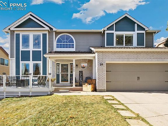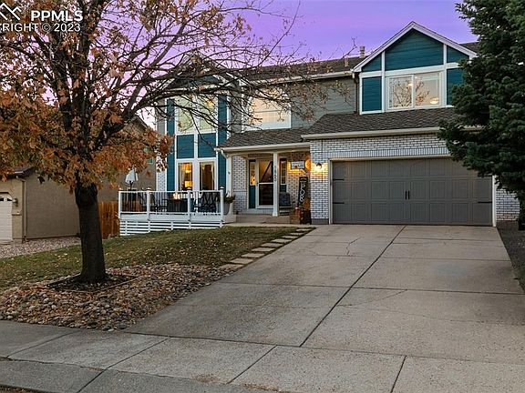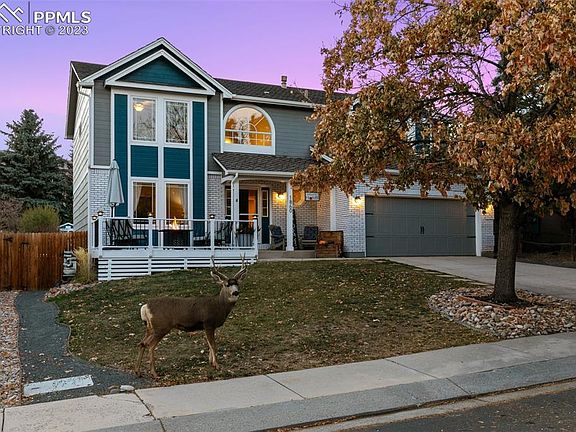 A Mountain Shadows gem! This 5 bedroom, 4 bath family home offers all the space needed whether inside or out. Enjoy morning coffee on the quaint front porch or evenings in the back BBQing, playing basketball or lawn games on the large grassy area or sitting on the large back veranda as you watch the sun set around the built-in firepit. The veranda also includes pull down shades. Entering the home the floors have beautiful laminate wood floors (installed in 2020) throughout the main level. The bright spacious dining room looks into the beautiful backyard. The updated kitchen boasts of granite counters, painted cabinets, new refrigerator (2023), electric stove (gas stove will be removed and replaced with electric), pantry, a walk out to the backyard and a clear view into the family room with its cozy wood burning fireplace. Updated powder room off the 2 car garage. The second story of the home includes 4 bedrooms including the expansive primary suite. Newer carpet in 2021. The primary suite boasts vaulted ceilings, a generously sized walk-in closet, and updated 5pc bath includes double vanity, soaking tub, freestanding shower with two shower heads, and separate water closet. Three additional bedrooms and updated hall bath fill out the second floor. The finished basement includes a freshly painted 2nd family room, a guest bedroom, a spacious full bathroom, office/flex space, and storage spaces. New furnace installed in 2019, water heater in 2020, and AC in 2022. Newly painted exterior in 2021. Excellent hiking nearby at either Ute Valley Park or Blodgett Open Space* Numerous neighborhood parks including Wilson Ranch Pool* Easy Access to I-25