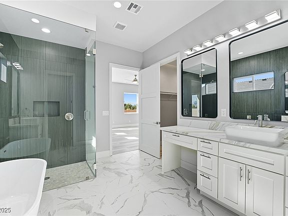 Welcome to this stunning 2,220 SF custom home on a 1/2-acre lot with soaring 10’ ceilings and 8’ doors throughout. This 3-bed, 3.5-bath home includes a private mother-in-law suite with kitchenette (sink, microwave & fridge) perfect for guests or multi-gen living. The chef’s kitchen features all appliances & wet bar with fridge and sink. Pre-wired for surveillance, CAT6/HDMI & IT closet. Upgrades include dimmable recessed lighting, recessed TV outlets, nightstand lamp switches & power/data for workstations. Outdoors, enjoy a covered patio, full outdoor kitchen (cooktop, sink & fridge), and a large backyard prepped for a pool or shop. Drive-thru 3-car garage with 8’ doors, RV parking with gates with 50-amp service & full hookups. laundry room, electric fireplace, 400-amp service, solar prep, front yard irrigation, timer lighting, desert landscaping & washer/dryer. Call for information on financing - Builder has already bought down the rate.