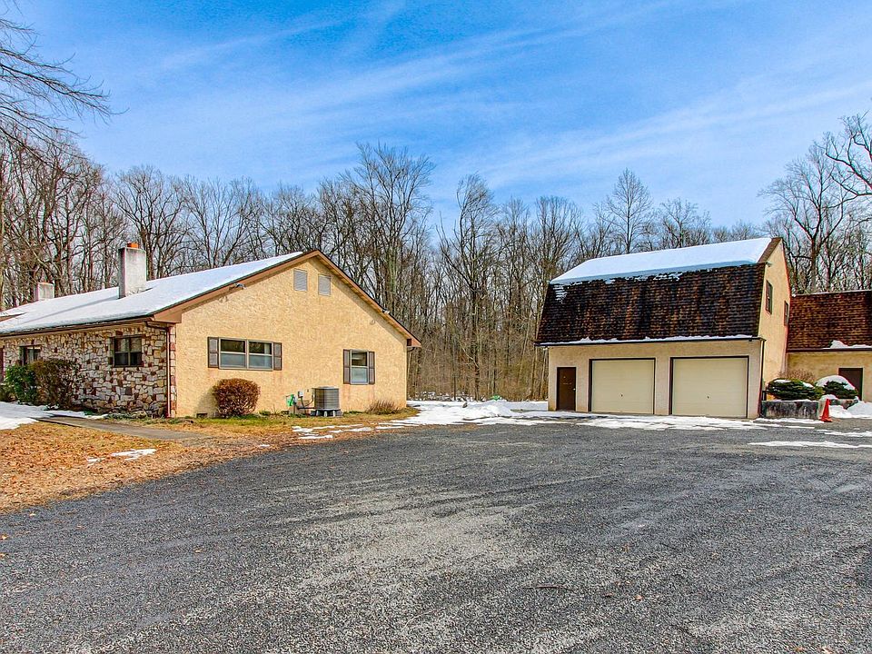 Welcome to this charming stone-front ranch home, peacefully tucked away in Upper Bucks County! Situated adjacent to state game lands and only minutes away is Lake Nockamixon marina. The property boasts a spacious layout, complemented by a massive detached 2-story heated garage with approximately 4,000 square feet. A covered front porch invites you into the double-door entrance foyer. The interior unfolds with 3 bedrooms and 2 baths, providing a comfortable living space. To the left of the foyer, discover the living room with a cathedral ceiling, ceiling fan, and a striking stone floor-to-ceiling wood-burning fireplace. French doors open to a delightful patio, perfect for enjoying your morning coffee. On the right side of the foyer, the dining room is enhanced by a bay window, chair rail, and a volume ceiling. The kitchen, with its vaulted ceiling and recessed lights, is a chef's dream. Features include a center island with cabinets and a wine bottle rack, oak cabinetry with a lazy-susan, corner cabinet appliance garage, all complemented by a double sink, Jenn Air wall oven, electric cooktop, and a range hood in oak. The family room is a cozy retreat featuring another stone wood-burning fireplace. Venture down the hall to discover the primary bedroom, complete with a walk-in closet and private bath boasting a dual sink vanity, corner shower, and a luxurious drop-in tub with jets. Two additional bedrooms share the hall bath with a large storage closet. The utility room with pull-down steps leads to a partially floored attic. Conveniently located laundry room includes a utility sink, and back door access to a covered concrete patio. The garage is more than just a place to park cars, it's perfect for the car enthusiasts or a woodworker.