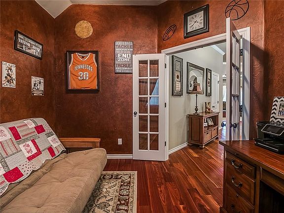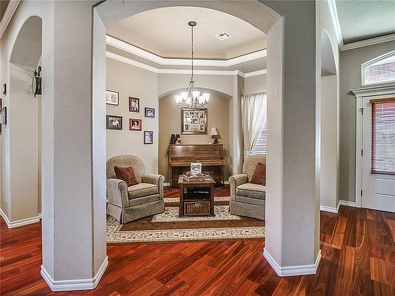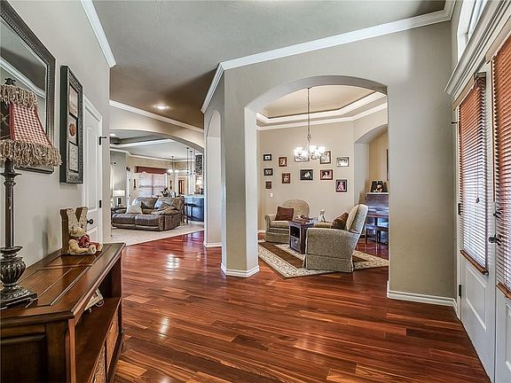 What a Dynamite Floorplan this home offers! From the open concept living, dining and kitchen to the separate owner's and children's wings to the study (or 4th bedroom), the large laundry or the 3rd bath with access to the back patio, this home is sure to please. With amenities like real hardwood floors in foyer, study and formal dining (currently used as second sitting area), multiple double and triple windows, tray ceilings and crown molding, this home is so inviting. The large kitchen features an extra large, curved breakfast bar accented by rock columns; granite counters, stainless appliances that include dishwasher, double oven, builtin microwave and gas cooktop; and a center island plus a large walkin pantry. Both the master bath and the children's jack-n-jill bath have extra long double vanities. With a mud bench and oversized laundry room, infloor storm shelter in garage, fenced backyard and 30x40 shop, this property has so much to offer plus its under 30 minutes to OKC!
