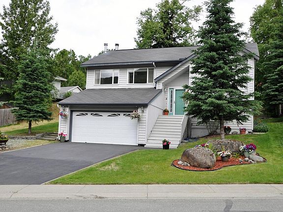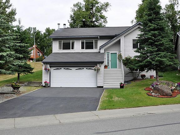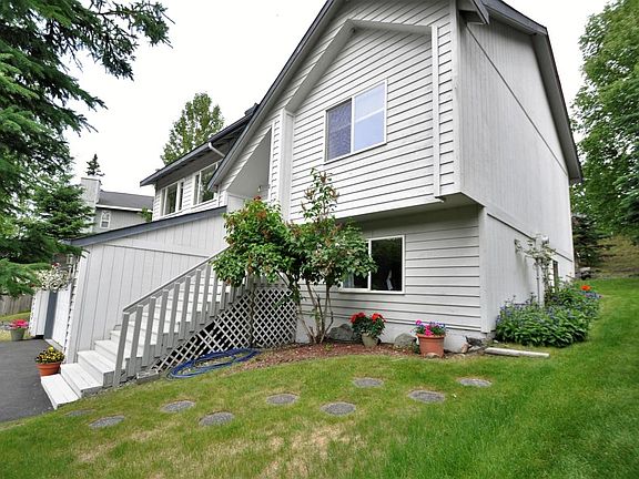 Picture windows invite sunshine through this wonderful home w/tall vaulted ceilings in LR/DR & kitchen. New roof, water-heater, and furnace. Fresh paint, new lights, new SS appl, includes gas stove, new granite countertops, both bathrooms remodeled. 2 Bedrooms up & 2 down w/family room. New slider w/large back deck and gazebo equipped with hot tub connection. Views of the mountains will take your breath away. Paved walking trails throughout subdivisions. Close to schools, parks, shopping & short drive to JBER