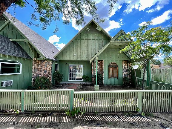 This incredibly unique house is a must see! With twin peak roofs, a detached garage, a detached work shop, a covered sitting area with beautiful mountain views, and a vegetative and lush yard, this is a perfect place to call home. Stepping inside, the home features tile floors, two bedrooms (with the potential to add a third), a built in office / desk space, separate dining room, and a living room with vaulted ceilings. The master bedroom features a large walk in closet, with a full bath, and vaulted ceilings. This unique home is perfect for a couple, as an investment property, or the small family looking to get out of the city and experience a lovely neighborhood and community.