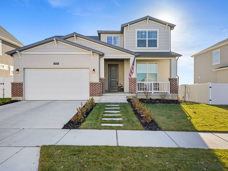 OPEN HOUSE SATURDAY, NOVEMBER 22nd between 11 AM and 1:30 PM! Welcome home to this stunning property in Overland! Step into the beautifully designed entryway and living room. THE KITCHEN IS STUNNING, featuring upgraded white cabinetry, stainless steel appliances-including a gas range and oven, quartz countertops, large walk-in pantry, large island for extra counter space and seating, and stylish laminate flooring that ties the space together. RETREAT TO THE SPACIOUS PRIMARY BEDROOM that is surrounded by windows, offering generous natural lighting throughout the day. ENSUITE PRIMARY BATHROOM includes a deep garden tub with separate shower, dual sinks, and a walk-in closet, providing you with all the comfort and storage you need. SPACIOUS UNIFNISHED BASEMENT provides endless potential with room to grow, entertain, or add instant equity. ADDITIONAL HIGHLIGHTS: covered front porch, huge laundry room with shelves, cold storage room, backs up to Desert Sky Elementary. SMART HOME FEATURES include smart thermostat, smart sprinkler control, video doorbell, permanent holiday lights, electric vehicle (EV) charging. WHY GO THROUGH THE HASSLE OF BUILDING when you can move right into this fantastic home, complete with a FULLY LANDSCAPED and FENCED YARD-all ready for you to enjoy. HOA Fee includes maintenance of common areas, pump (bike) track, pickleball court, playground, community events, walking paths, access to pool, picnic area, clubhouse w/firepits. Nestled along the western side of the Lake Mountains, Overland not only provides big views, but an escape from the big city while enabling its residents to feel a strong sense of community. This is achieved by Overland's close proximity to trails, schools, and multiple nearby parks. Enjoy the nearby amenities, such as shopping centers, numerous dining options, movie theaters, museums, golf courses, and Utah Lake. Square footage figures are provided as a courtesy estimate only and were obtained from an appraisal. Buyer is advised to obtain an independent measurement.