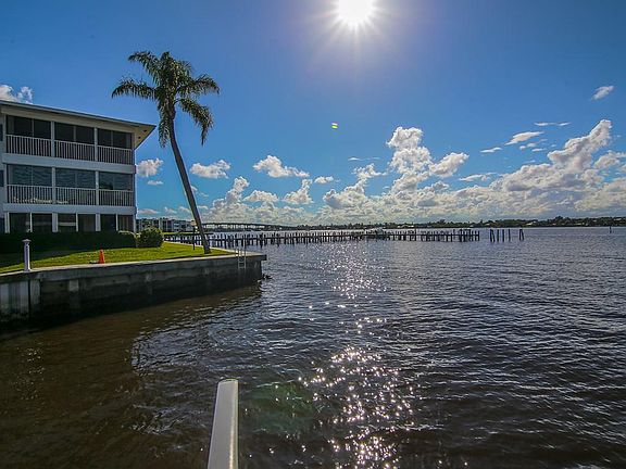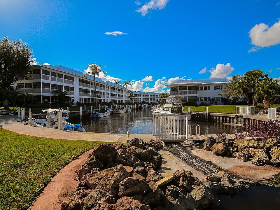 Waterfront condo with dock space for up to a 30foot boat near Downtown Stuart. Completely updated 2 bedroom, 2 bath, with large patio is a corner unit with a garden view & views of the canal. TURN KEY CONDO! Completely updated! Beautiful kitchen with granite counter tops, white cabinets with crown molding, mounted under cabinet lighting and double ovens. The condo has tile on the diagonal and wood laminate floors throughout. A large patio the whole length of the unit to relax and enjoy the views. Washer & Dryer, Plantation Shutters, Accordion hurricane Shutters for all windows & doors, storage unit and 1 small pet allowed. The community has 3 pools, club house and this condo comes with a boat dock for up to 30ft boat. Located 5 minutes from Downtown Stuart, Very centrally located for dining, shopping or going to the beach! Immaculately Maintained! Active community, 55+.