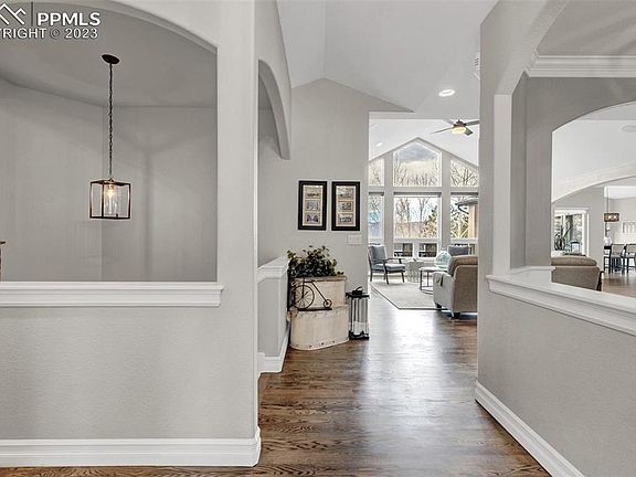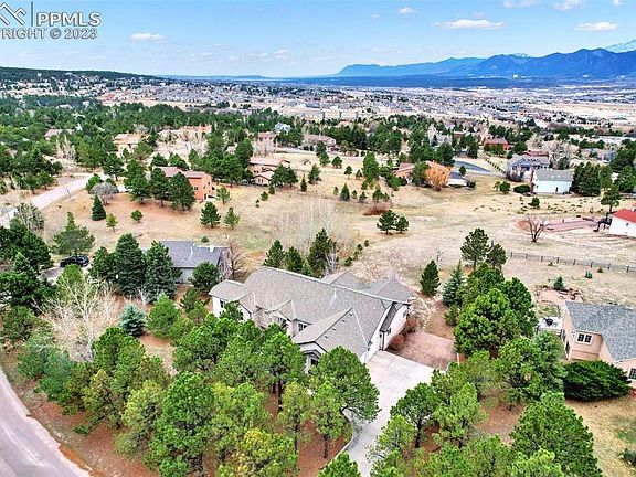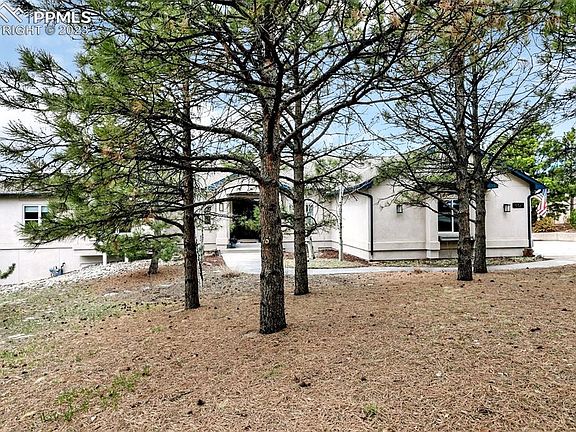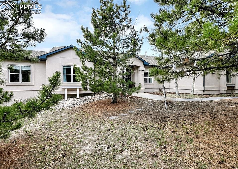 Impeccable custom home with stunning front range views situated on almost an acre in trees! Warm and inviting main level features wood floors, neutral colors throughout and an abundance of natural sunlight. Great Room boasts wall of windows, vaulted ceiling, custom woodwork built ins and contemporary gas fireplace. Tastefully appointed finishes make this a Chef's dream Kitchen. Jenn Air stainless steel appliances include a wine refrigerator and warming drawer, granite countertops, island with gas range, pantry, glass tile backsplash and back lit glass cabinets. Cozy breakfast nook with window seat located right off kitchen. Primary Retreat has vaulted ceiling and attached 5-piece master bath with frameless walk-in shower, rain shower head, heated tile floors, double sink vanity and storage. Two Additional bedrooms - one with a built-in desk perfect for an office and one with Jack N Jill full bath. Powder room and Laundry room with utility sink and washer and dryer and a 3 car garage with epoxy floor complete the main level. The fully finished walkout basement has 9ft ceilings and is perfect for entertaining. The wet bar has granite counters, wine rack and beverage refrigerator. The bright, open Family room features recessed lighting, gas fireplace with stone surround and built-ins. Walk out to the covered patio which includes a motorized sunshade, epoxy floor, hot tub and spectacular views for days! There is a guest suite with attached full bathroom, two additional spacious bedrooms with Jack n Jill full bath. Flex room is currently a workout space. Remarkable craftmanship displayed throughout. Updated lighting, custom woodwork, 2 fireplaces and central vacuum are additional features. Woodmoor has 156 acres of common area, a community center, is in an award winning school district and is located only minutes from nearby amenities, close to trails and parks and I-25 for easy commuting to Denver or Colorado Springs.