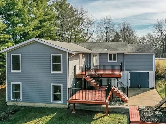 Single-family home built in 1965. The residence offers 3 bedrooms and 2.5 bathrooms within approximately 1,900 square feet of living space, all situated on a 1.19-acre lot. The home features a welcoming living room with wood flooring and a large picture window that allows ample natural light. The kitchen is equipped with 42-inch maple-style cabinetry, a tiled backsplash, ceramic tiled flooring, and includes a refrigerator. The expansive primary bedroom boasts a vaulted ceiling, private access to a deck, and a luxury bathroom with a whirlpool tub and separate shower. The partially finished lower level offers a family room, iron-style spindled staircase, ceiling fan, half bath, and walk-out access to a spacious patio overlooking wooded surroundings. The property includes an oversized one-car garage, a two-car-wide driveway, and an additional one-car garage/workshop located beneath the main garage. Multiple decks and a spacious patio provide serene views of the wooded lot, Welcome Home.