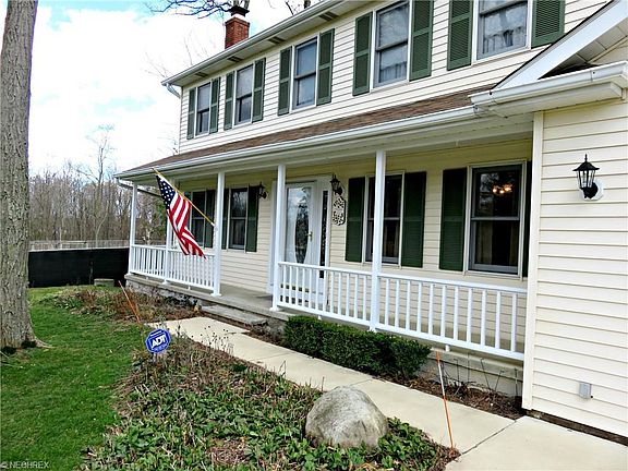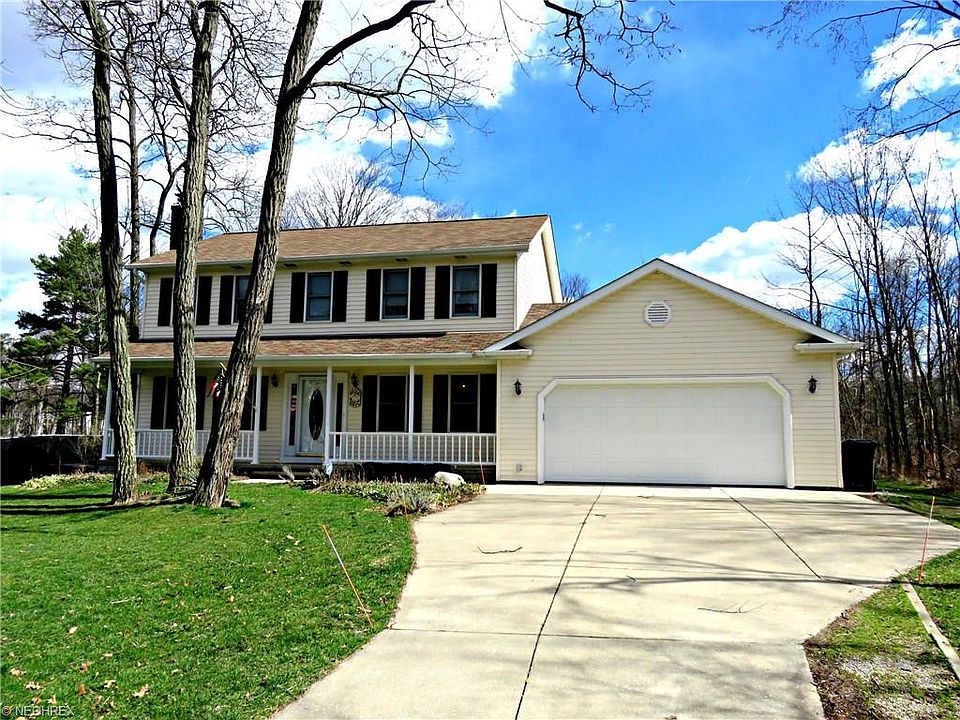 Charming Strongsville Colonial nestled on 1.4 wooded private acres showcases the perfect combination of country living & city conveniences! Tucked back 400 ft from the street this home boasts lovely curb appeal as you travel down the winding driveway past the extra parking pad and greeted by the full front porch. Inside, you will take notice to the living room w/ hardwood floors & fireplace, formal dining room, den and laundry. An addition was added in 2005 to include a spacious eat-in kitchen w/ cherry cabinets, granite countertops, breakfast bar, included appliances, planning desk, dinette area and hearth room w/ cozy fireplace. Upstairs are 3 generous bedrooms featuring the master bedroom w/ a vaulted ceiling, double closets & en-suite bath. The lower level supplies a finished recreation room, office space and storage area. Beautiful backyard with wooded views, patio, garden area & 20x20 outbuilding. A true must see home to appreciate. Call today for a private tour!