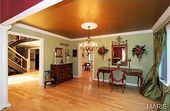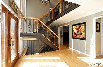 Enchanting curb appeal instantly draws you in to this custom remodeled home. A two story foyer, with open staircase, beautiful lighting and impressive millwork, reveals endless possibilities. Wood floors flow effortlessly from room to room. WOW the gourmet in your family with large eat-in kitchen complete with 6 burner gas stove, stainless appliances, custom cabinets, big center isle and granite counters. Step out to the deck or relax in the massive sunroom off the sunken great room overlooking a lush backyard and updated pool. First floor stylish powder room with slate floors, huge laundry and office. Master suite is an indulgent treat with custom walk-in multi-head shower, jet tub and custom tile. Three more large beds, plus updated hall bath with jet tub, dual sinks and custom floor top off the 2nd level. Walk out lower level with full bath. Roof one year old. Newer plumbing and pool systems. Updated with uncompromising quality, finish and style in prime Chesterfield location.