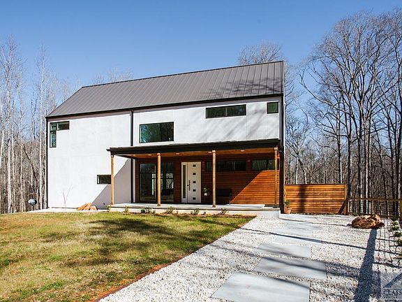 Welcome to 1863 Gober Road situated in charming Bishop, Georgia. This newly constructed Euro-contemporary home in highly sought-after Oconee county sits on just over 10 acres of pristine conservation protected land flanked by two bodies of running water and mature hardwood trees. This 4 BR 3 BA home stands on the highest elevation point on the property with sweeping views both north and south. Completed in 2020, this custom built home has 2600 square feet of European minimalist design aesthetic throughout the beautiful white hard coat stucco structure. Clean lines and expert use of space complement all the light and airy rooms. Large Pella windows and glass doors, large scale solid wood doors and 9 foot ceilings throughout home. Warm blonde maple hardwood floors on main floor. Tasteful yet utilitarian sound buffering carpet on second level. Entering the home from a generous front porch there is a useful mud room, office and custom storage area / pantry room to your right, a spacious, comfortable living room to your left with large windows allowing lovely views outside. An expertly designed kitchen with island downdraft cooktop, white quartz countertops, beautiful tile backsplash, plenty of custom cabinetry for storage all accent this room. Generous eat-in area with built-ins and room for a large table next to wall-to-wall windows offering an abundance of cheery, natural light. Private, main level bedroom and full bathroom allow for guests or a nanny / manny suite. Large deck for entertaining off back of home with beautiful views of forest and stream beyond. Upstairs there is a great room for entertainment, media or just hiding away. Reading nook with window bench accent this large multi-functional space. Two bedrooms with large closets and a dedicated full bathroom outfitted with quartz countertop, tiled bath and separate water closet to the right. Master suite across the home has clean, custom closets, clerestory windows, make-up nook, and large light and bright spa-like bathroom with quartz countertop, double vanity, soaking tub, tiled shower and water closet to the left. Full private laundry room off master with additional secondary exit. Basement level allows 800 square feet of unfinished space stubbed for plumbing and a multitude of possibilities.This area also has built-out " dog room " with exterior dog door to backyard and a perfect hobby / work area with peg board.. Exterior access as well as two-car garage with additional storage on this level. Other notable construction features include Brazilian hardwood rain screen, standing seam metal roof, and thoughtful gutter and storm water system. Huge floored attic space for storage with pull-down ladder. Newly poured concrete driveway, eco-friendly and beautiful porous walkway leading to front porch, wild-flower planted front yard and professionally installed sodded fenced backyard. This home is located just minutes from Oconee country schools, shopping and recreation. A short drive into Athens and The University of Georgia.