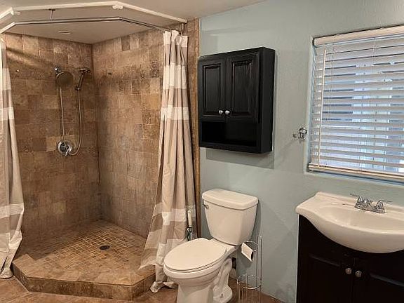 Ready to move in, clean and freshly painted. Cute little house with 2 areas for beds, huge custom stone shower inside, stove with oven, refrigerator, microwave, ceramic floor with a carpeted loft, air conditioned, ceiling fans and whole house fan to keep you cool. Fully fenced large back yard shaded by oak trees, and a garden area in front. Outdoor shower with hot and cold water, covered patios with elect and an Outdoor fireplace. Laundry onsite with 2 washers and 2 dryers, shared. Dog breed must be approved by the owners/ insurance. Utilities are extra. First month's rent of $2,100 and a security deposit of $2,100 due at time of signing month-to-month rental agreement. Renter to pay 25% of elect bill each month on the following 15th of the month. Bill ranges from $100.00 to $200.00 depending on the weather. Trash and water are included in monthly rent.