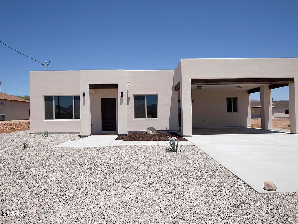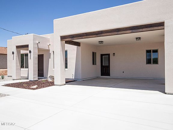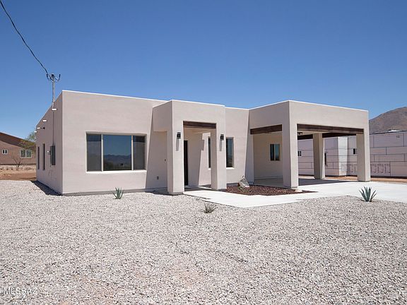 High Quality Construction not normally seen in Rio Rico. Beautiful 3 bedroom 2 bath house with a bonus room off the kitchen. Could be used as a Butler's Pantry, Office or Exercise Room. 9 foot ceilings throughout. Oversized windows, custom concrete overlay flooring, ceiling fans in all bedrooms and family room. Large island in the kitchen with granite countertops on all wood constructed cabinets with soft close drawers and doors. 40'' Tall Wall Cabinets in the kitchen. Large Bathrooms, Rear Patio off the master bedroom. stainless appliances , extra Large Laundry. 2 car carport. All interior walls have been insulated between rooms for soundproofing. Sitting on a 1/4 acre lot with majestic mountain views front and back.
