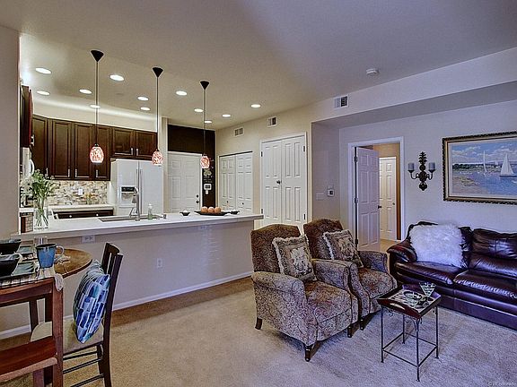 TURN KEY.... Beautifully remodeled/updated 2b/2ba ground level end unit. Many, many upgrades. Open floor plan and great light. Custom new Travertine tile throughout. 42' custom cabinets. Remodeled custom (concrete) counters throughout. New tile backsplash. New kitchen can lights with pendant lights over counter. Deep farmers stainless sink. Newer appliances. Kitchen includes custom (interchangeable) lighting above and below cabinets for your entertaining and mood lighting. Upgraded window coverings. Beautiful/updated/remodeled bathrooms. Extra space can be used for office or dining use. Custom tiled fireplace in living room. Garage has extra storage cabinets and 220v. MLS# 8835406 Sharon Blotcher Gather Realty ENGLISHACCENTONHOMES@GMAIL.COM (303) 377-8100
