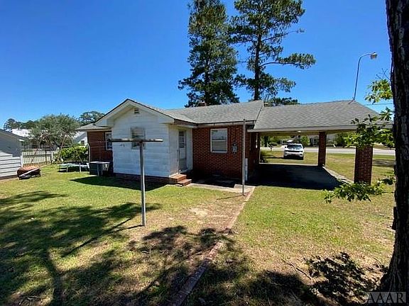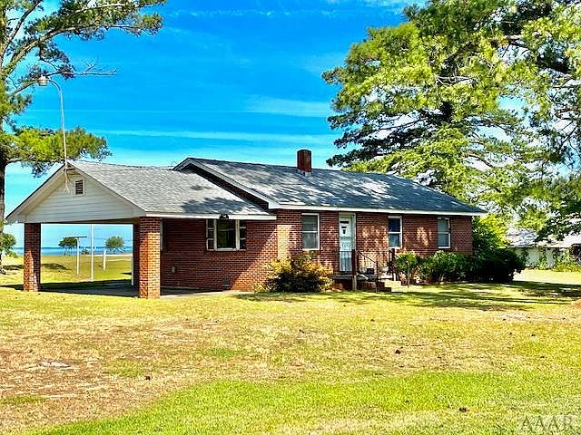 Water views and a cute vintage brick ranch offers 3 bedrooms, 1 bath, oak floors, wide pine panelling, oak floors and a carport. There is a detached outbuilding/workshop. This home offers good views of the Albemarle Sound from the dining room and back yard. Property is offered as-is. HVAC is a gas pack (LP gas tank was leased and has been removed).