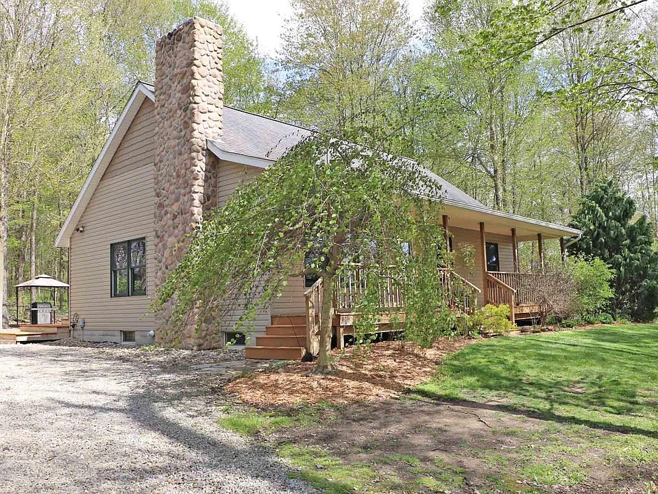 Drive up to this beautiful, secluded property nestled in the woods w/ just under 2300 sq ft of living space that is situated on a charming 10-acres. Walk up the front covered porch into this amazing home into the Living Room w/ Wood stove opening into the Cabinet filled Kitchen, this home features Cherry hardwood floors throughout, six panel solid wood doors, master bedroom with private bath, 2 bedrooms, stairway to loft, & home office. Partially finished clean basement with lots of possibilities, plumbed for a full bath,& huge laundry room/storage area. Walk out back to the spacious/huge deck and the landscape backyard that leads you to the cabin. The Cabin features an open concept with living room and kitchen, 2 bedrooms, 36 inch doors & amazing bathroom. Enjoy this one of kind property!