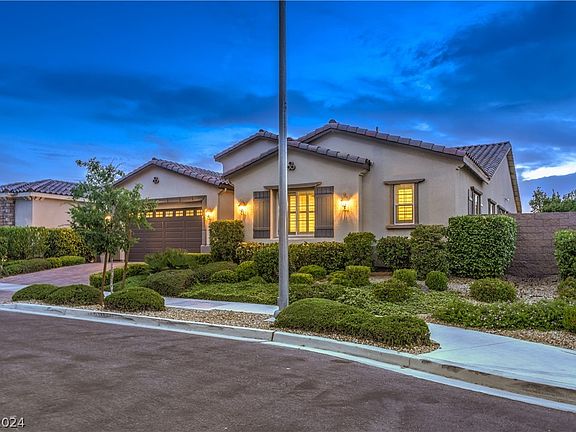 VIEWS! VIEWS! VIEWS! This incredible Toll Brothers Trapani will knock your socks off! Extensive vistas of majestic mountains, city and strip lights and spectacular sunsets every night. Featuring three ensuite bedrooms, the 4th being converted to an office (could easily be changed back), and a three car tandem garage, this property has been immaculately maintained by original owners. Upgrades galore, including gas fireplace with stacked stone surround and custom built-ins in the oversized family room. Rear stacked sliding doors to the enormous covered patio allow you to take in the views 24/7. The chef's kitchen is a dream, with professional appliances, including built-in refrigerator, double ovens, five burner cook-top, trash compactor and wine fridge, as well as a huge pantry. The primary suite is separate from other bedrooms and is highlighted by a custom closet and spa-like bath. Owners have exclusive access to Toll Brothers community pool and fitness center around the corner.