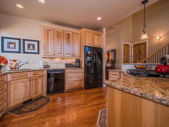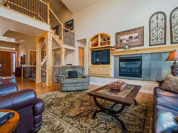 Gorgeous home on private lot with views of soaring Ponderosa pines. Backs to Plum Creek Golf Course. Mountain view from the loft. This home features high-end finishes throughout. Open floor plan allows light to pour in from a wall of windows. Gourmet kitchen with 42" custom cabinets and slab granite. Hardwood floors. Large Master Suite with sliding glass doors to private patio, vaulted ceilings, walk-in closet and nicely appointed Master Bath. Beautiful 8' Alder doors throughout. Designer window treatments are included! Fire suppression system. Speakers in LR, DR and Master with separate controls. Central vacuum system. 3M film on west-facing windows and patio doors. Media Room in basement. 9' basement ceilings. 2 water heaters. Fireproof safe. $30k in upgrades. No maintenance living - HOA includes mowing. Enjoy beautiful sunsets from your choice of 2 patios!