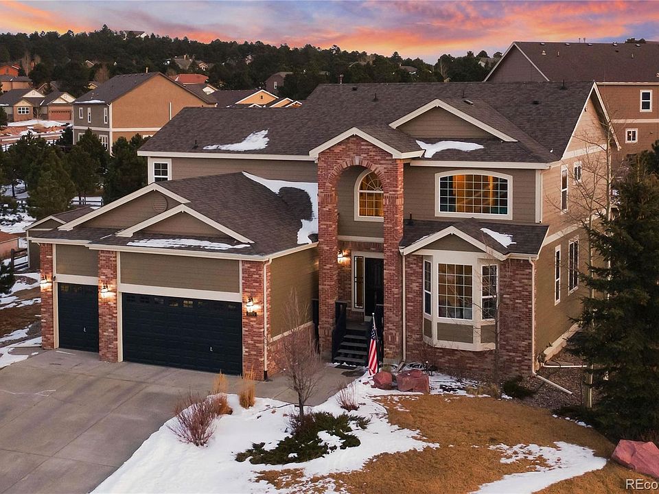 Must See This Gorgeous, Spacious Former Model Home on a Corner Lot, Mountain Views. Great Room adjacent to gourmet eat in kitchen, granite countertops, lots of Beautiful cabinetry with Island, stainless steel appliances, gas cook top, double oven. Main floor has beautiful medium stained oak flooring into the kitchen and master bedroom. Tiled/solid surface 5 piece bath, with water closet, Walk in closet enter thru bath. Updated sliding door to back yard. Laundry/mud room exits to deep 3 car garage. Updated sliding door to back yard. Designed to be mostly maintenance free back yard, designed for entertaining. Astro turf lawn with putting green. Tuff shed. Composite decking as you exit kitchen and additional composite decking area with open air privacy screen. Concrete pad with natural gas hook up for gas grill. Wood Fire pit included. Up stairs Large rec/media rooms and 3 large bedrooms, The 3rd bedroom could be second Master with large walk in closet adjacent to a 2nd full bath. Basement finish 2016 beautiful hand railing to match upstairs. Open rec/media area, large workout room, could be considered 5th Bedroom, with a large walk-in closet. Large storage room includes heavy duty storage racks and safe/gun safe. Bathroom with quartz counter top and beautifully finished tile shower. Rough in for a bar area. New Paint on Exterior. Ideal location 25 min to south Denver /15 min to N. Academy in Colorado Springs. Come enjoy ideal Colorado living.