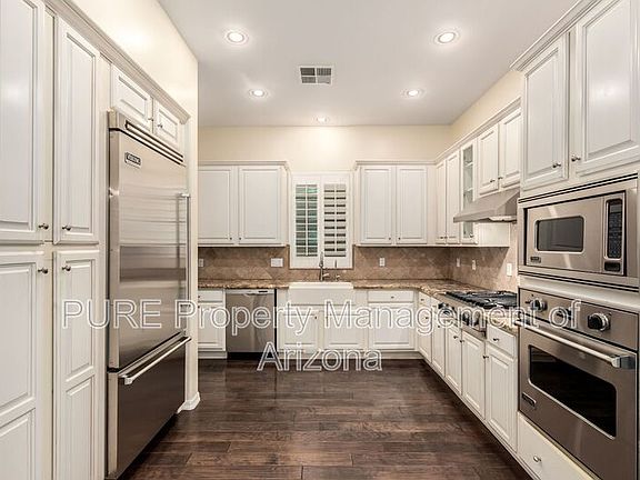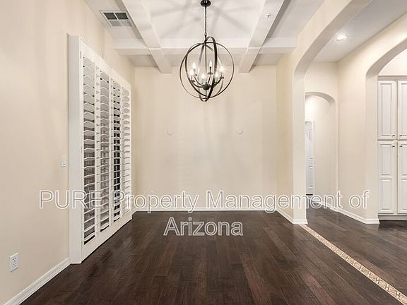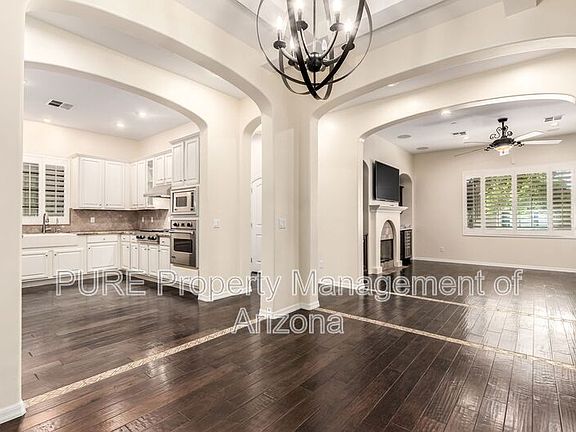 Welcome to a rental that feels like home from the moment you step inside. Warm hardwood floors, elegant shutters, and graceful archways set the tone for comfort and charm. Gather in the cozy living room with its fireplace, dry bar, and built-in surround sound, or host special dinners in the formal dining space. The chef's kitchen delights with granite countertops, stainless steel appliances, and custom finishes. Retreat to the primary suite with its spa-like bath and private exit. Outdoors, relax on the serene patio or enjoy nearby pools, fitness, sports courts, trails, and shops. This home is truly irresistible!