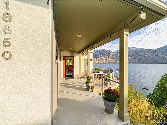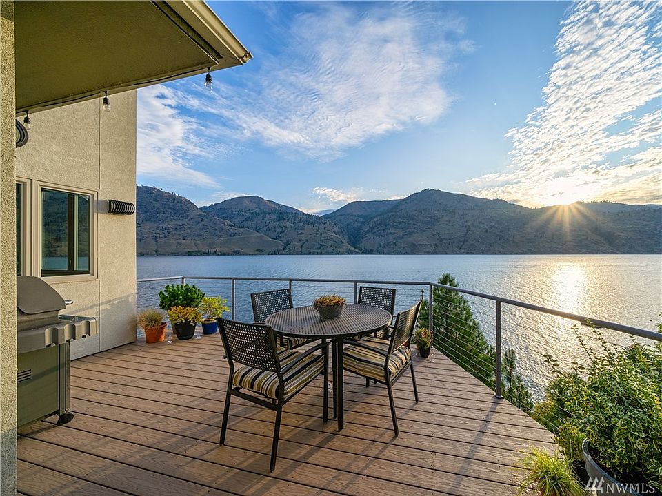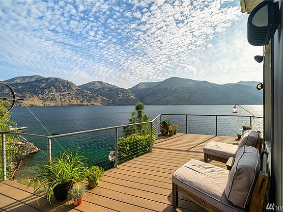 This architect-designed custom modern home has high ceilings & large windows bringing in the spectacular view. A large loft sleeps 4, so the home comfortably sleeps 8. The stucco & metal exterior & mature, irrigated landscape make for easy lake living. This one owner meticulously maintained home features lots of storage, 2 car garage, Cherry counter tops & cabinets, Pro cook top, walk-in Slate showers, 3 decks & fireplaces inside & out. With 100' of WF enjoy your dock, boat lift & buoy today.