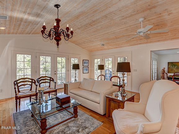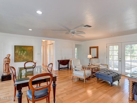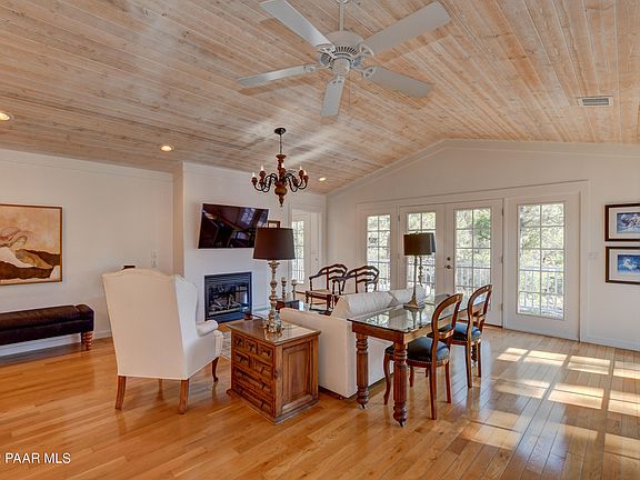 RARE FIND! GORGEOUS, PRISTINE SINGLE LEVEL and HANDICAP accessible home on .92 ACRES in Prescott WITH GUEST HOUSE. Perfect AirBNB! Close to Downtown and Thumb Butte w/Seasonal Creek on property. NO FLOOD INSURANCE NEEDED! This beautiful Farm Style home began as a cabin built in 1966 and has a series of extremely tasteful additions (all permitted) over the years to become the beauty it is today. Features 2 bedrooms and 2.5 baths with open concept PLUS an additional small OFFICE space. Additional spacious GUEST/CARETAKER QUARTERS is ADDITIONAL BR w/Kitchenette, 3/4 Bath, and SEPARATE ENTRANCE. Enter to a hallway leading to the Great Room where you will enjoy gorgeous hardwood floors, raised tongue-in-groove ceiling, gas fireplace and multiple French doors leading out to the 66 foot deck