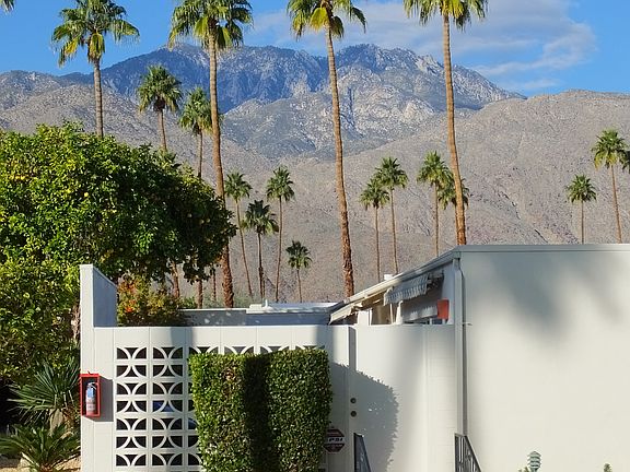 Tired of snowy winters? Why not own this beautiful condo in the desriable Araby Commons district of South Palm Springs where the only snow you might see is on the majestic San Jacinto mountains while lounging poolside? This spacious 1700+ square foot condo has 3 bedrooms (one currently repurposed), 1.75 bath, a large living room with two patio doors and an adjoining dining area and kitchen with Corian countertops and newer appliances. The 9-foot high ceilings in the living areas have a smooth surface that complement the beautiful floor tiles. The carpeted guest, and large master bedroom complete with built-in washer and dryer, each have a sliding glass door that leads out to the condo-length patio where you can enjoy the built-in gas barbecue and beautiful views of mountains and celebtrity hillside homes. The patio is just steps away from the central spa and heated pool. Seasonal fruit trees abound in the common area, some of which overhang the patio. This location sits further away from Hwy 111 than some properties being offered, allowing a more peaceful experience in an already quiet neighborhood. This property is walking distance to Araby Commons shopping center where there is a pet store, dining, banking, groceries, a pharmacy and a SunBus stop. The BUZZ Trolley is also located within 1/2 mile and provides free service on select days to downtown Palm Springs, where wonderful dining opportunities await. Minutes away by car are hiking trails and Indian canyons, public golf courses, Smoke Tree horse stables, casinos, Thursday night Village Fest, and the Palm Springs Aerial Tramway. This beautiful condo has one of the best locations in the interior of the complex and will provide a great opportunity for you to entertain your guests.